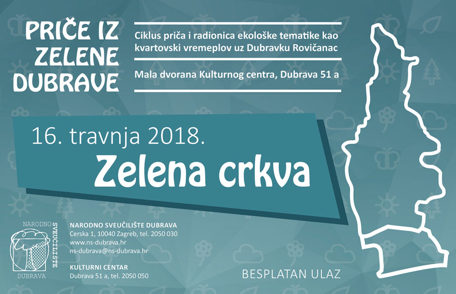 U ponedjeljak, 16. travnja 2018. godine, u 19 sati, u maloj dvorani Kulturnog centra, Dubrava 51 a, Narodno sveučilište Dubrava organizira besplatnu pričaonicu i kratku kreativnu radionicu za djecu pod nazivom Zelena crkva.